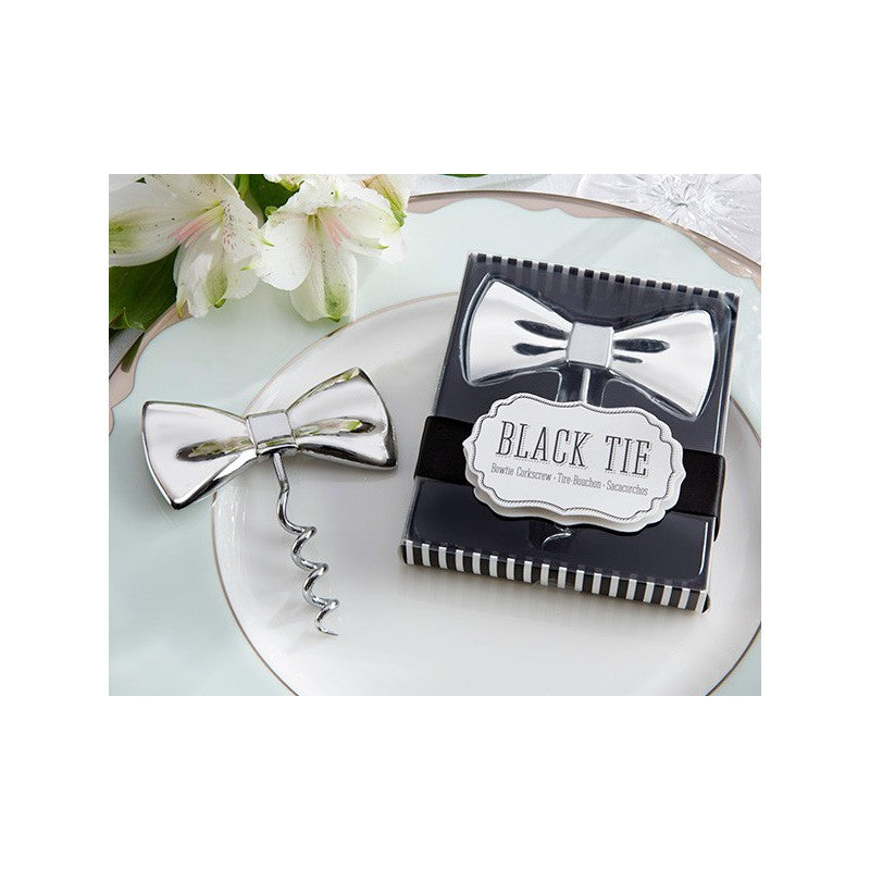 Abrebotellas con forma de pajarita presentada en caja de regalo decorada por una cinta negra y tarjeta "Black tie"