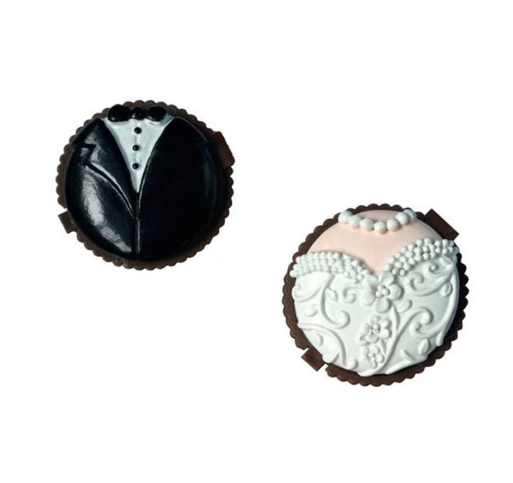 Bálsamos labiales en forma de esmoquin de caballero y vestido de novia. Un detalle práctico y original para regalar a los invitados de bodas.