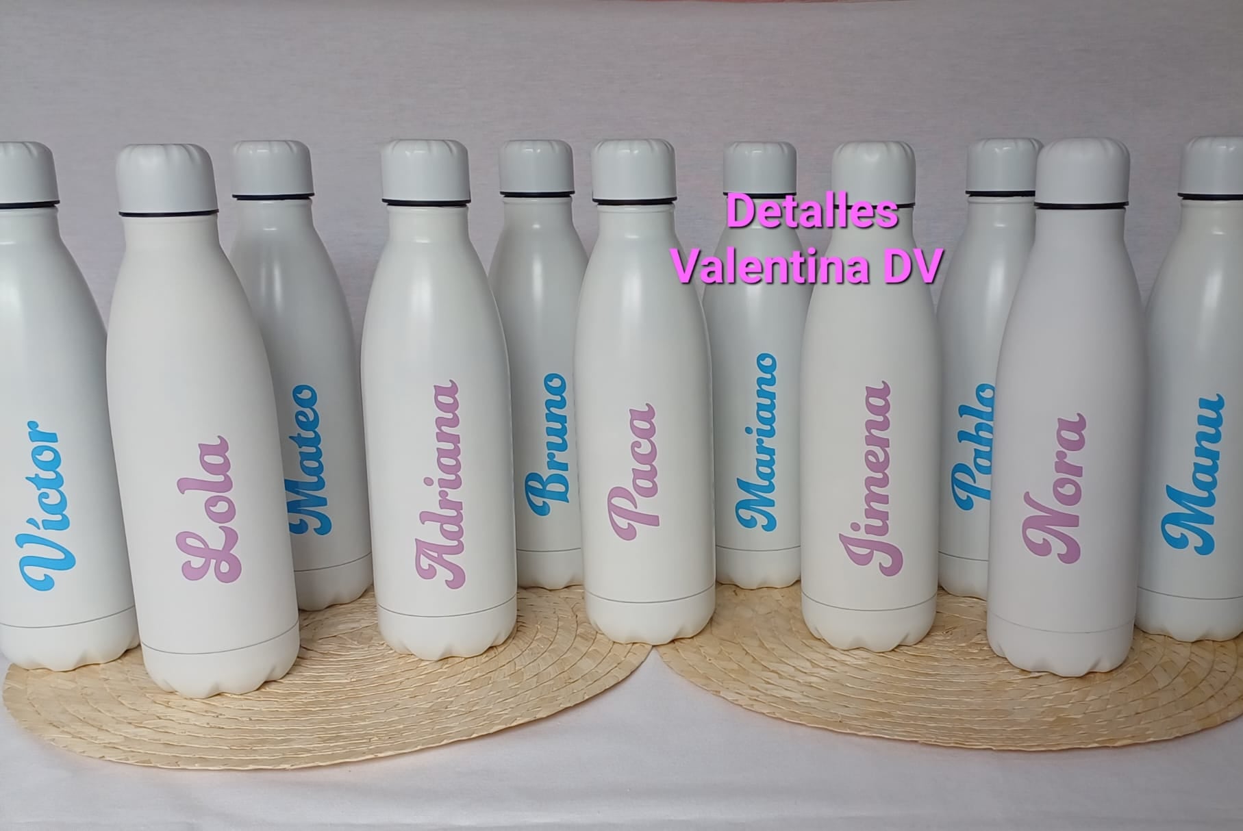 Botella en color personalizada con nombre en vinilo. Con tapón anti goteo.