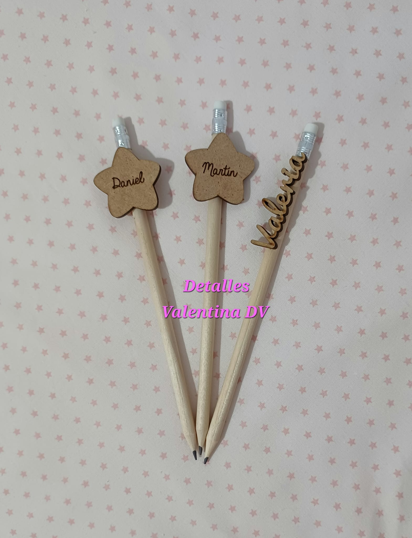 Lápices de madera natural personalizados con nombre de los invitados o del comulgante o protagonista del evento. Son ideales para utilizarlos como marcasitios para bodas, comuniones, bautizos, cumpleaños u otros tipos de celebración.