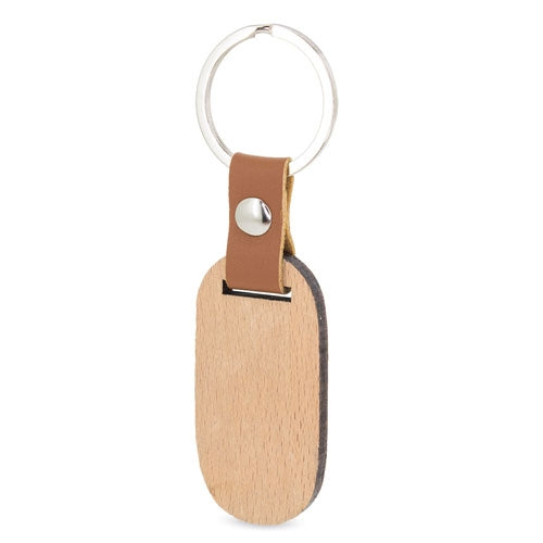 Llavero con forma ovalada realizado en madera, con terminaciones en elegante polipiel, remache efecto metalizado y anilla de acero. Personalización con grabado láser.