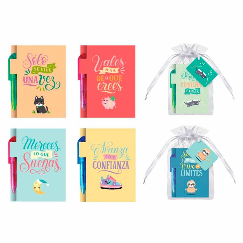 Libreta con frases presentadas en bolsa de organza blanca con lunares plateados. Sobre el cierre cuelga una tarjeta de cartón de distintos diseños. Contiene 100 hojas blancas lisas. Surtido en 6 diseños. Precio unitario.