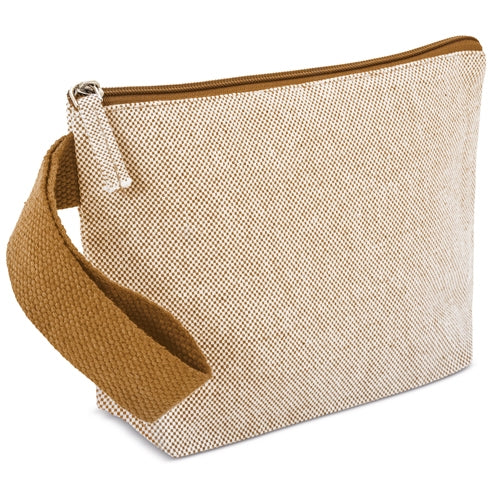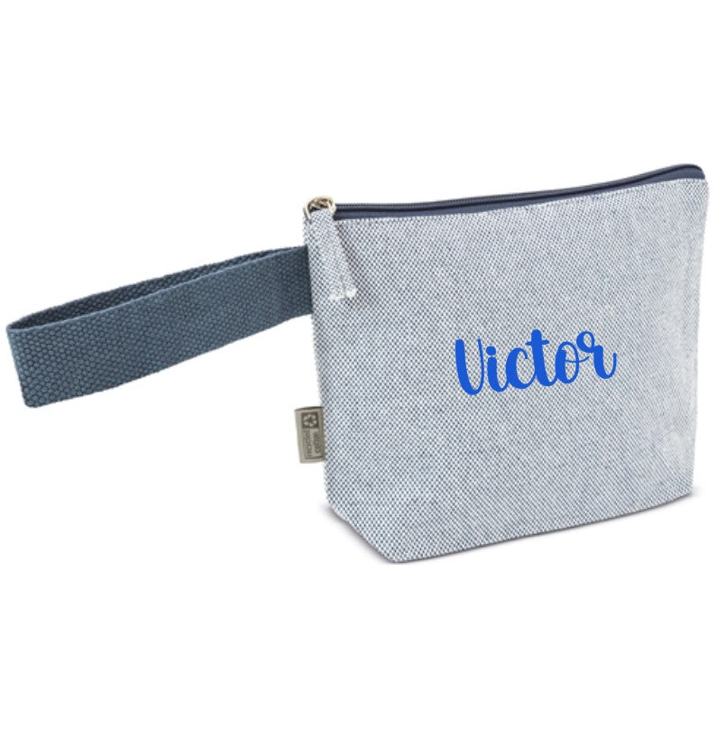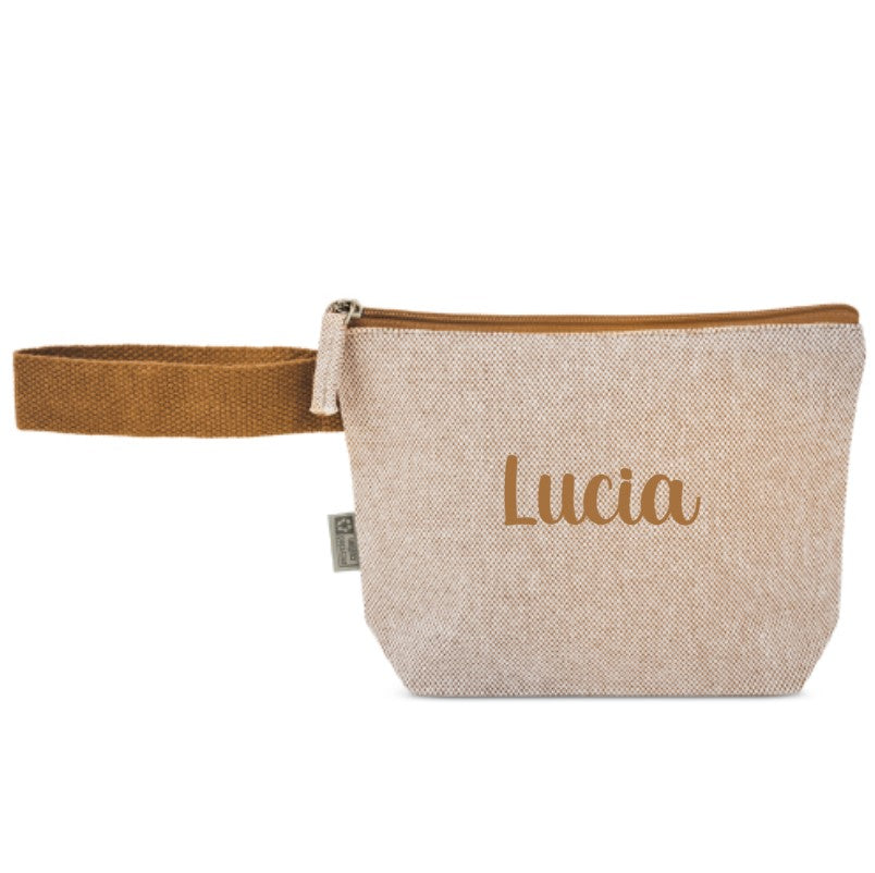 Neceser fabricado en algodón reciclado de aspecto jaspeado. Con asa de transporte para colgarlo o llevarlo en la muñeca.