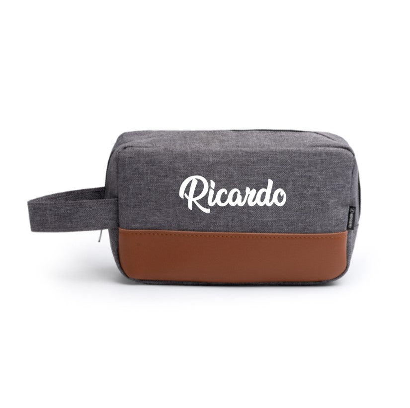 Neceser de poliéster reciclado RPET con detalles en PU Leather, ideal para marcaje. Incluye asa para transporte, combinando sostenibilidad y estilo. Transporta tus enseres de manera cómoda y elegante.