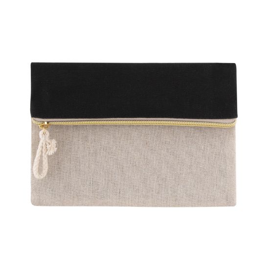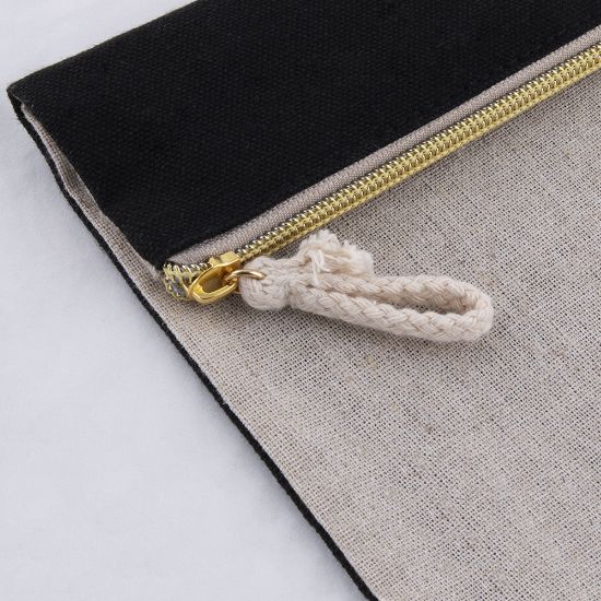 Neceser personalizado fabricado en algodón con caras en color natural y color negro. Con tirador de cuerda y cremallera en dorado.