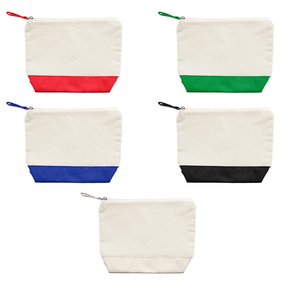 Neceser multiusos de algodón con acabado bicolor y cremallera con tirador de algodón a juego. Personalízalo con los nombres de los invitados de tu evento.