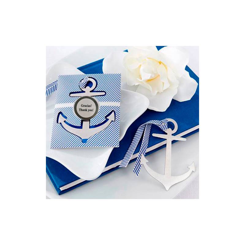 Original punto de libro de metal con forma de ancla marinera presentado en sobre de regalo. Incluye lazo y tarjeta. Tarjeta no personalizable.