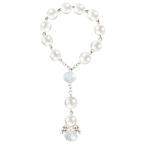 Rosario con ángel de la guarda, compuesto por eslabones de perla y piedras traslúcidas. Pedido mínimo de 15 unidades.