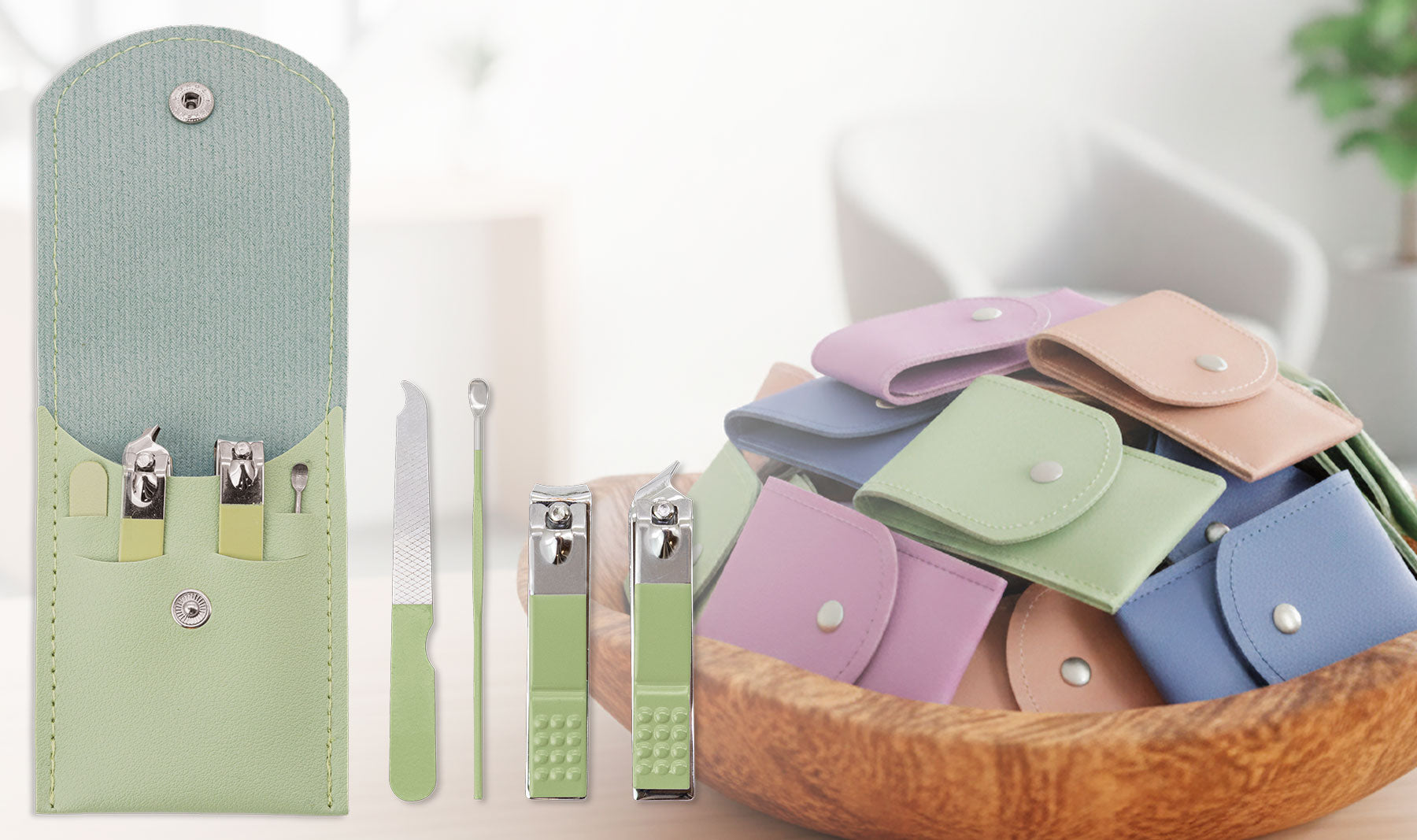 Nuestro set de manicura es un detalle ideal para las invitadas a tu evento. Disponible en cuatro colores, incluye dos cortaúñas, una lima y herramienta para las cutículas.