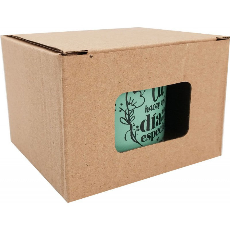 Tazas mate con frases de agradecimiento para los invitados de bodas, bautizos y comuniones. Se sirve surtida en 3 colores, verde, amarillo y blanco mate. Presentada en caja de cartón kraft con ventana.